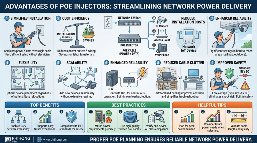 PoE injectors offer several advantages that make them a valuable addition to modern network infrastructures.