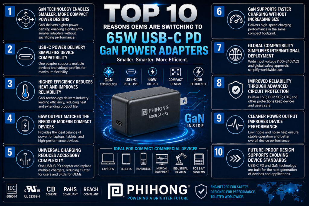 Phihong’s AQ65 series, including models like AQ65A, AQ65E, and AQ65K, sits directly in this transition point. These adapters combine GaN switching efficiency with USB-C Power Delivery, enabling OEMs to support laptops, tablets, medical equipment, and industrial handhelds with a single compact power solution. That convergence of efficiency, size reduction, and universal connectivity is exactly why OEMs are rethinking legacy adapter strategies.